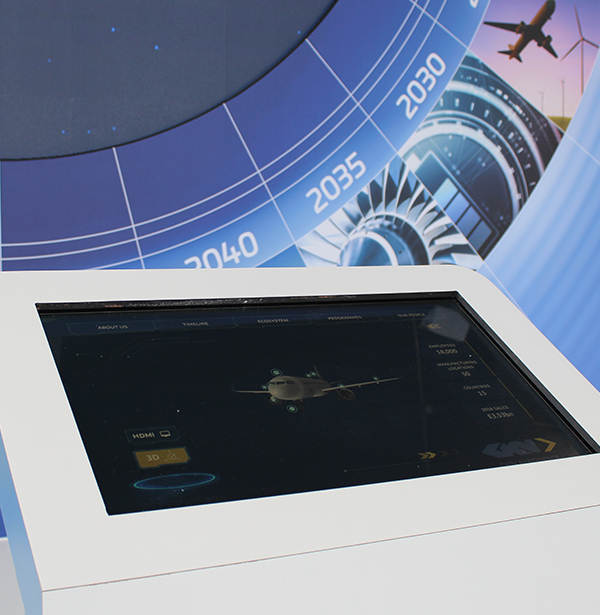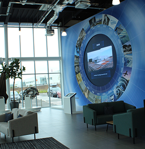 For such a high-profile project with a continually evolving brief, we were tasked with creating an interactive experience located in the glazed atrium entrance showcasing GKN’s pioneering technologies and vision for a sustainable aerospace future.