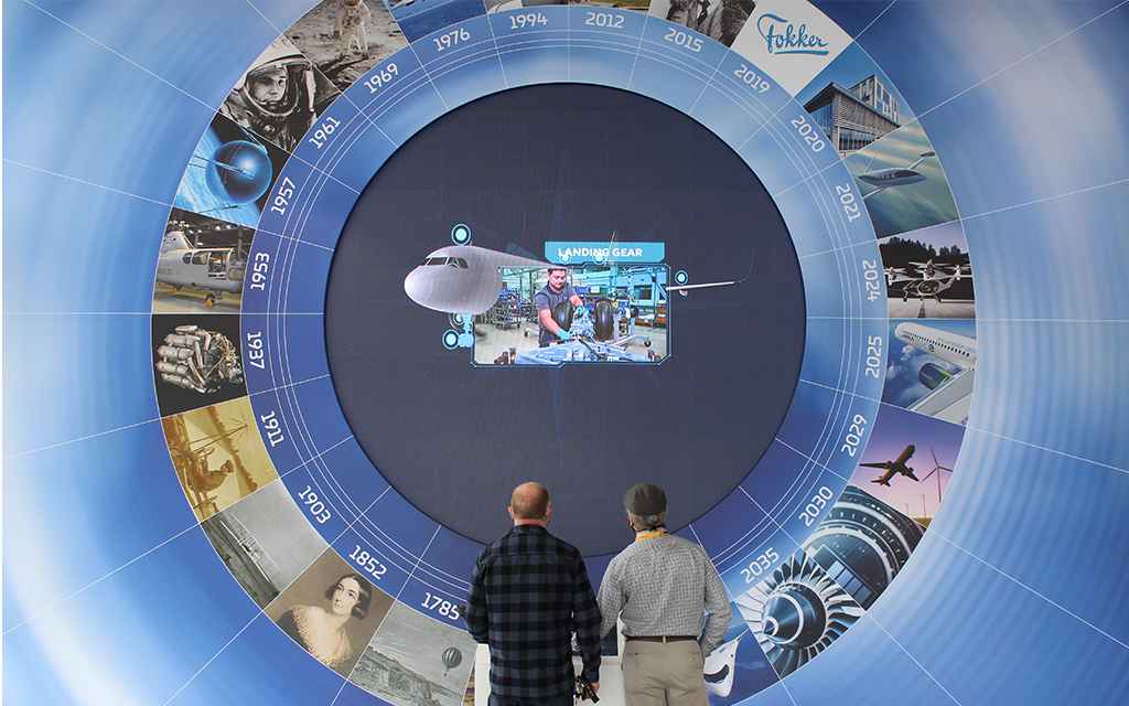 Our solution involved a new innovative technology known as ‘Portal’ which told the ‘One GKN Aerospace’ story on a 5m diameter hi-res LED screen in the centre of the Portal that visitors can interact with. Content such as ‘Global Collaboration and Clean Sky’ sustainability is navigated via the touch screen plinth and relayed onto the large circular screen.